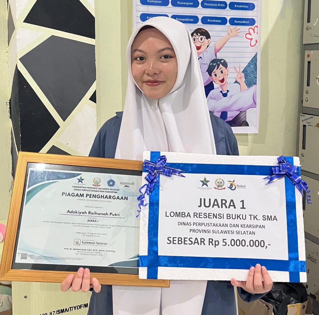 Makassar — Kabar membanggakan datang dari SMAIT Darul Fikri Makassar. Salah satu siswi terbaiknya, Adzkiyah Raihanah Putri, berhasil menorehkan prestasi gemilang dengan meraih Juara 1 Lomba Resensi Buku Tingkat SMA se-Provinsi Sulawesi Selatan yang diselenggarakan oleh Dinas Perpustakaan dan Kearsipan Provinsi Sulsel.