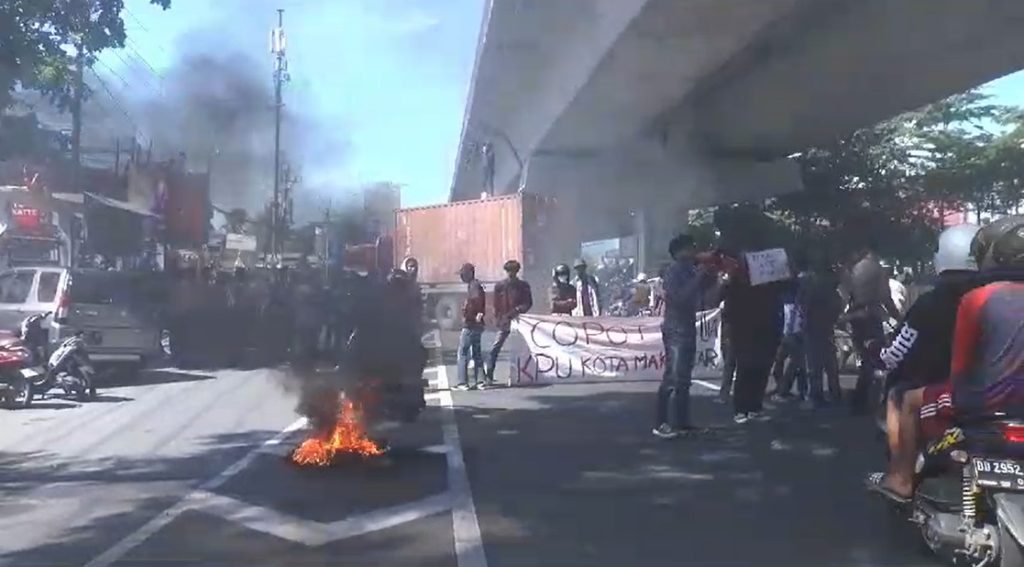 Pengunjuk rasa juga dalam aksinya menggugat lima pelanggaran yang dilakukan oleh KPU Kota Makassar. Yakni perhitungan rekapitulasi di KPPS melampaui waktu yang ditetapkan. Dua, C1 hasil Plenotak lengkap di KPPS dan tertukar. Tiga, Terjadi keterlambatan pendistribusian logistik yang lambat di 15 TPS di Makassar. Empat, Mencederai jalannya demokrasi.